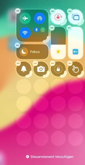 • Ein oder mehrere Steuerelement(e) entfernen: Tippen Sie oben links auf dem Steuerelement auf die Taste „Entfernen“. (Das kleine Minus-Zeichen)