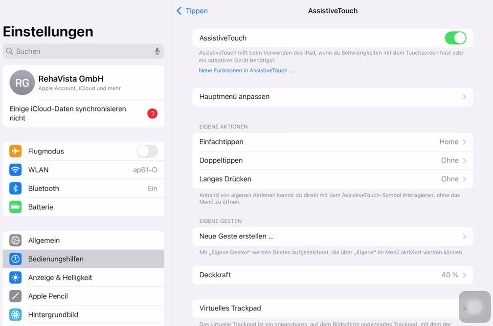 - Schalten Sie über den Schieberegler „Assistive Touch“ aktiv (siehe Abb. 1)