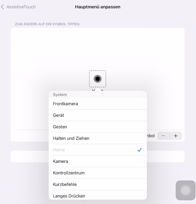 Wenn Sie einen virtuellen Home-Button ohne jegliche andere Funktionen möchten, konfigurieren Sie AssistiveTouch wie folgt: