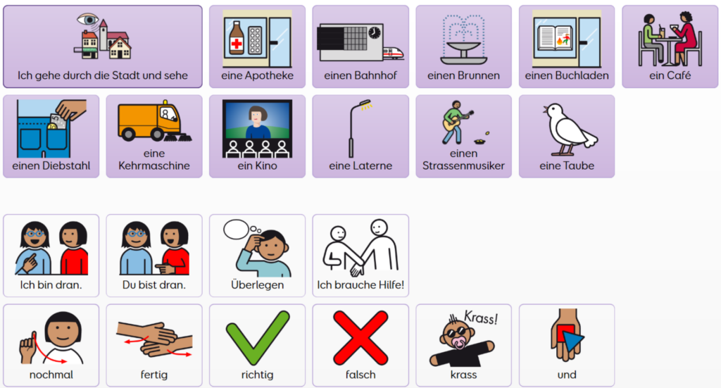 Das interaktive Spiel wendet sich an alle Interessierten – unabhängig von Alter und Fähigkeiten. Menschen mit Lautsprachen machen ebenso mit wie Menschen ohne. Dafür wurde das Spiel so gestaltet, dass alle Mitspieler:innen ihre Fähigkeiten nutzen können, um sich am Rundgang durch die lebendige Stadt zu beteiligen: Symbolen, Gebärden, Hilfsmitteln oder Lautsprache.